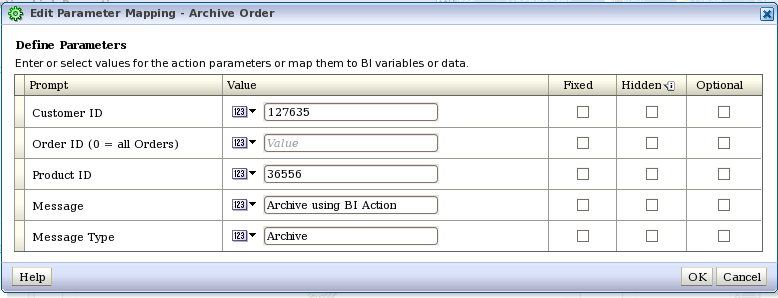 Each action will navigate to or invoke a target. The target for an action may accept parameters. In this case, the Archive Order action invokes a web service that will write out some order details to an archive log. It accepts various parameters, including Order ID, Product ID, Customer ID and a message from the user. When we attach the action to a dashboard page, we can map values and variables to these action parameters.